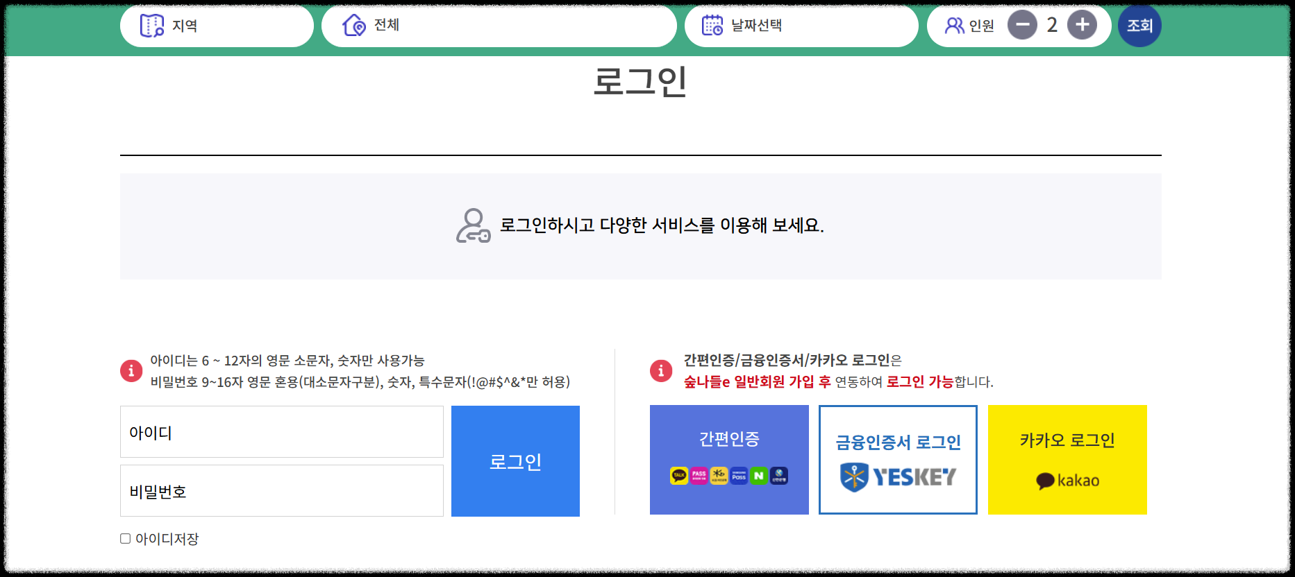 - 숲나들e 회원가입: 주민등록 기반 실명 확인과 이메일․전화 인증 필수 - 간편 로그인 제공: 카카오, 금융인증서 연동 로그인 사용 가능