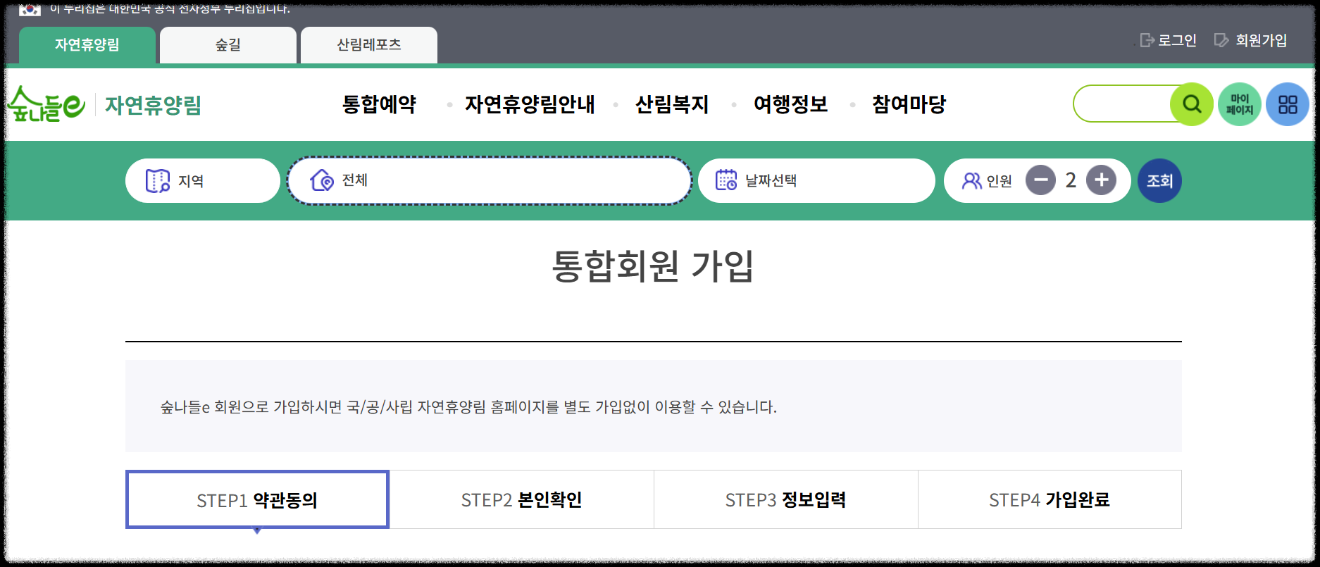 - 지역/휴양림/이용 날짜/인원 수 입력
