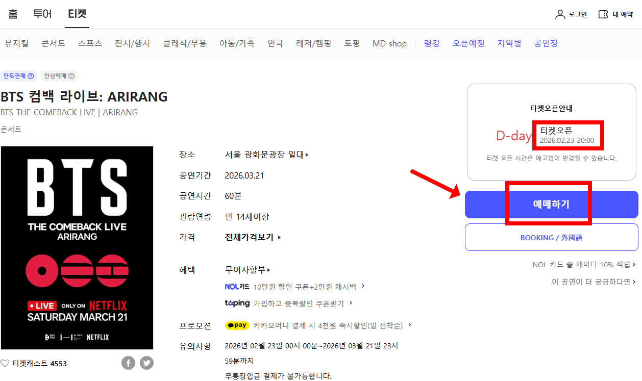 | 예매 일시 | 오늘! 2월 23일 (월) 오후 8시 |