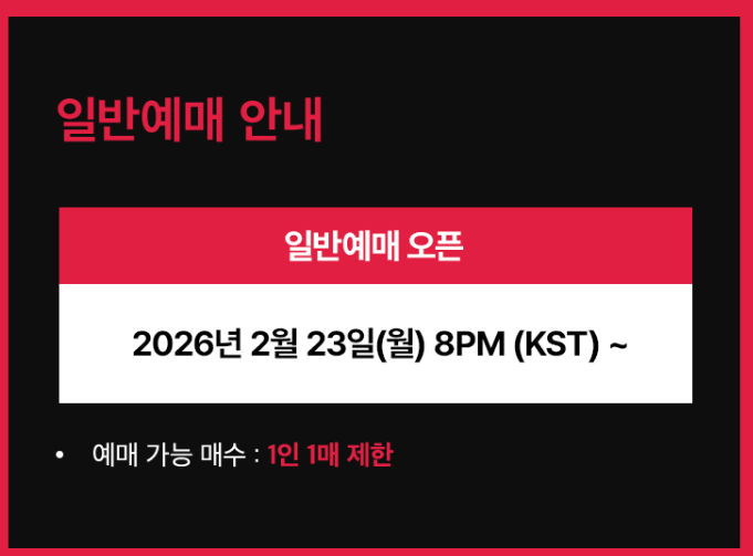 | 예매일 | 2026년 2월 23일 (월) 오후 8시 |