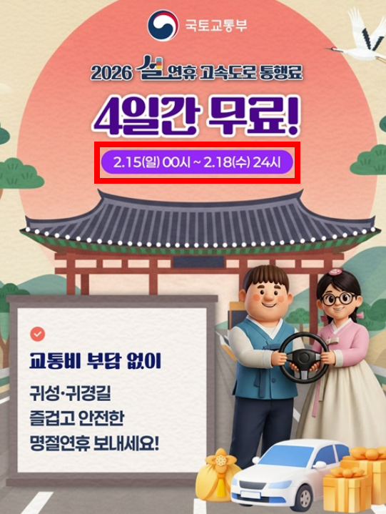 2026 설연휴 고속도로 통행료는 총 4일간 무료로 확정되었습니다. 면제 기간은 2월 15일(일) 00시부터 2월 18일(수) 24시까지이며, 무료시간 기준은 ‘출구 통과 시점’입니다. 이번 글에서는 설연휴 고속도로 할인기준과의 차이, 민자고속도로 포함 여부까지 실제 운전자 입장에서 바로 이해할 수 있도록 정리했습니다.