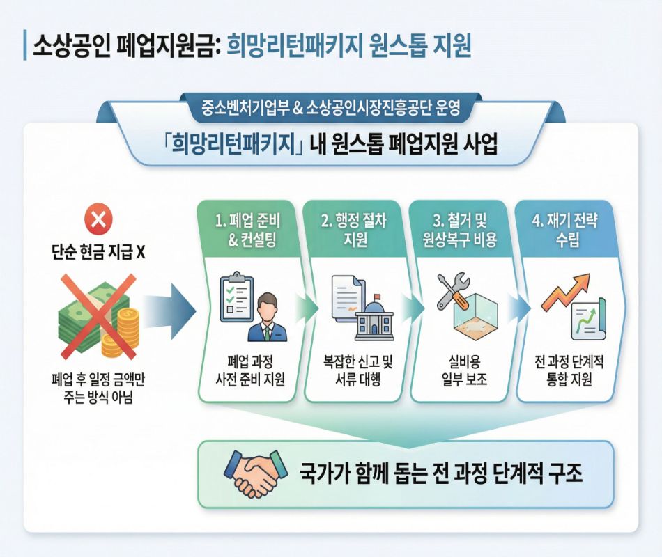 소상공인 폐업지원금은 중소벤처기업부와 소상공인시장진흥공단이 운영하는 「희망리턴패키지」 내 원스톱 폐업지원 사업입니다.