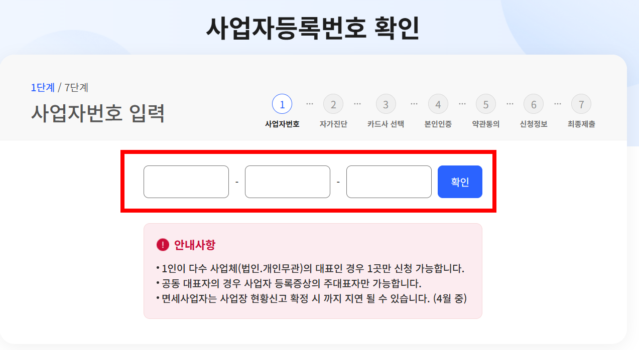 ② 휴업·폐업 상태: 홈택스에서 사업자 상태를 조회해보세요. 휴업 중이면 신청 불가입니다.