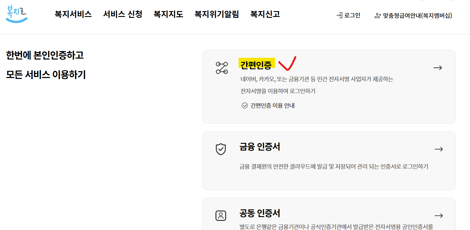 먼저 복지로 사이트에 접속해서 로그인을 합니다. 저는 간편인증이 편해서 이거를 활용했어요. 편하신 로그인 방법을 선택하시면 됩니다.