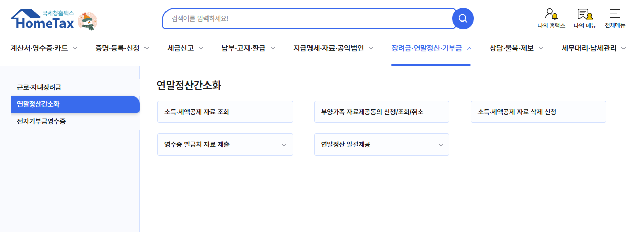 - 연말정산 메뉴 진입 - 상단 메뉴에서 "장려금·연말정산·전자기부금" 클릭 → "연말정산간소화" 선택
