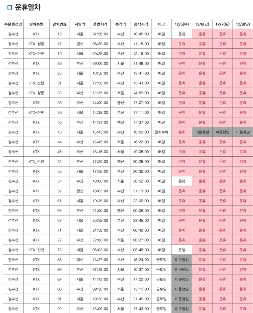 파업이 시작된 5일부터는 평소의 70%만 운행될 예정입니다. 특히, 서울과 부산, 대전 등 주요 도시 간의 열차 운행이 줄어들어 출퇴근 시간대에 불편이 클 것으로 보입니다. 구체적인 운행 중지 열차는 다음과 같습니다: