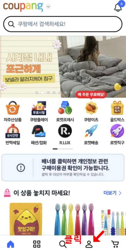 - 쿠팡 앱 하단 [마이쿠팡] 아이콘 클릭