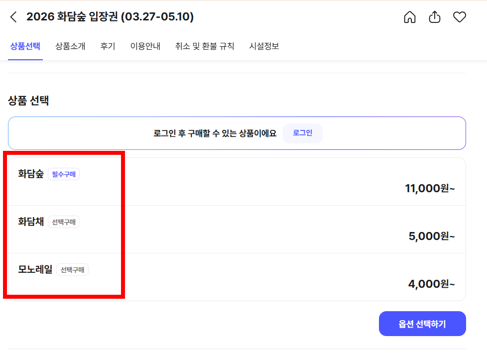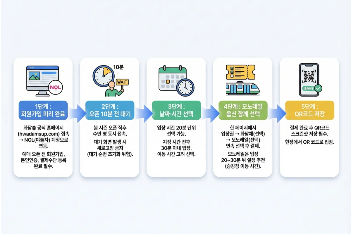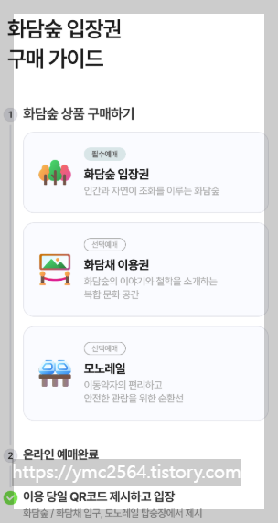 입장권 → 화담채(선택) → 모노레일(선택) 순서로 한 페이지에서 연속 선택 후 결제 가능해요. 모노레일은 입장 시간보다 20~30분 뒤로 설정하는 게 좋아요 (승강장까지 이동 시간 고려).