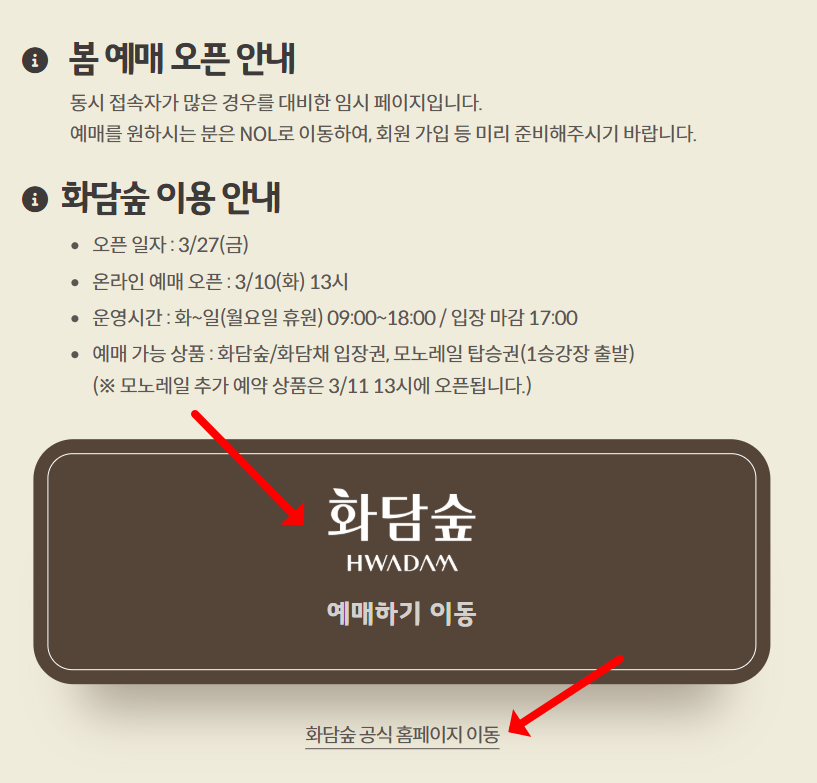 - 예매 오픈: 3월 10일 오후 1시 (입장권·화담채) / 3월 11일 오후 1시 (모노레일)