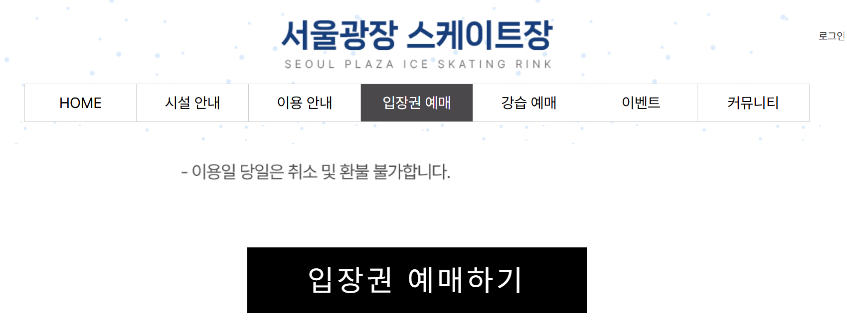 서울광장 스케이트장 공식 홈페이지에 접속하여 입장권 예매 탭으로 들어가서 입장권 예매하기 버튼을 누릅니다.
