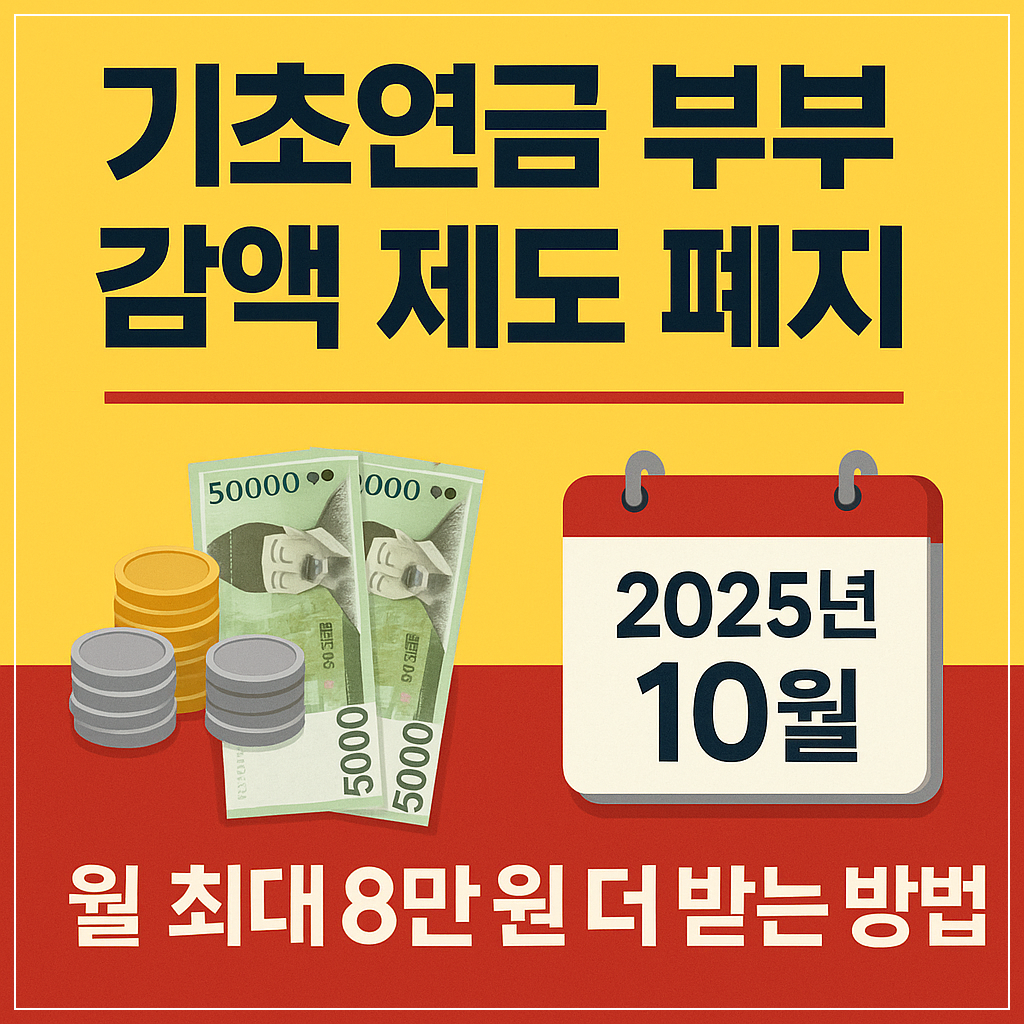 2025년 10월부터 기초연금 부부 감액 제도가 폐지되었습니다. 부부가 모두 기초연금을 받아도 더 이상 20% 감액되지 않습니다. 기존 수급자는 재산정 신청이 필수! 오랜 기간 논란이 되어왔던 '부부 감액' 제도가 드디어 사라지면서, 전국 약 140만 고령 부부 가구에게 실질적인 혜택이 돌아가게 되었습니다. 하지만 아직도 많은 분들이 이 변화를 모르고 계시거나, 알고 있어도 어떻게 신청해야 하는지 몰라 망설이고 계십니다. 특히 기존에 기초연금을 받고 계신 분들은 자동으로 금액이 증액되는 것이 아니기 때문에, 직접 신청하지 않으면 계속 적은 금액만 받게 됩니다. 이번 글에서는 변경된 제도의 모든 것과 놓치지 말아야 할 신청 방법까지 상세히 안내해드리겠습니다. 월 최대 8만 원, 연간 192만 원까지 더 받을 수 있는 방법을 지금 바로 확인하세요!