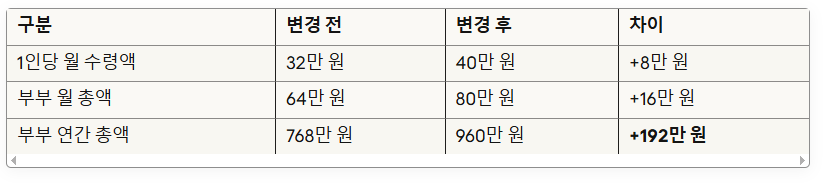 - 부부 수급자: 각각 월 32만 원 수령 (20% 감액)