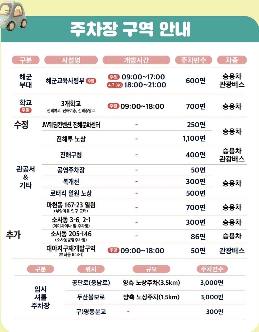 - 관공서 외: JW 웨딩컨벤션~진해문화센터, 진해루 노상, 진해구청, 복개천, 야미차이나 앞 주차장, 소사동 공영주차장 등