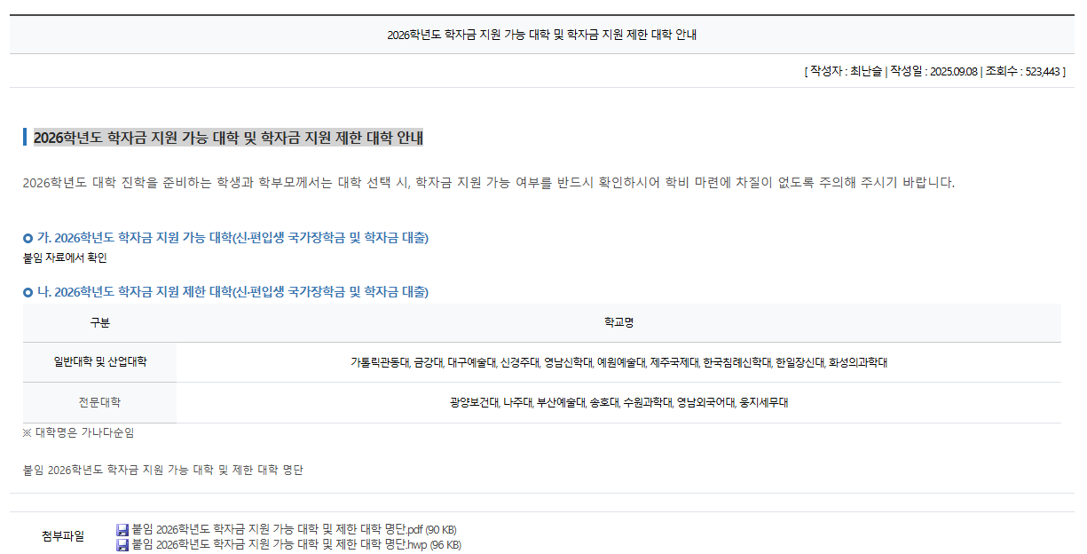 2026학년도 학자금 지원 가능 대학 및 학자금 지원 제한 대학 확인 바로가기
