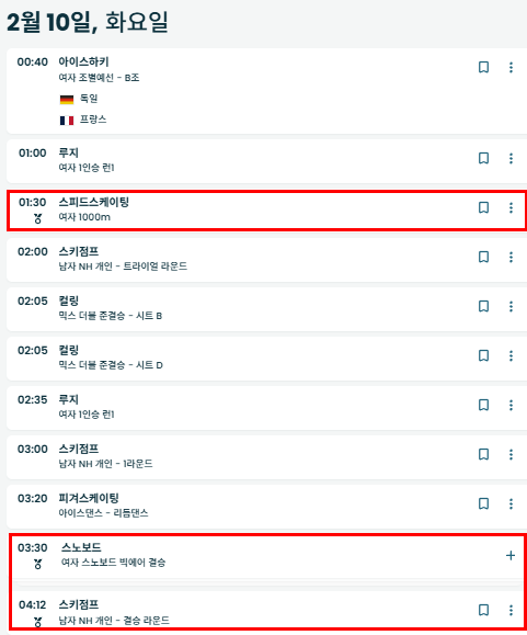 | 2/10(화) | 새벽 1:30 | 여자 1000m |